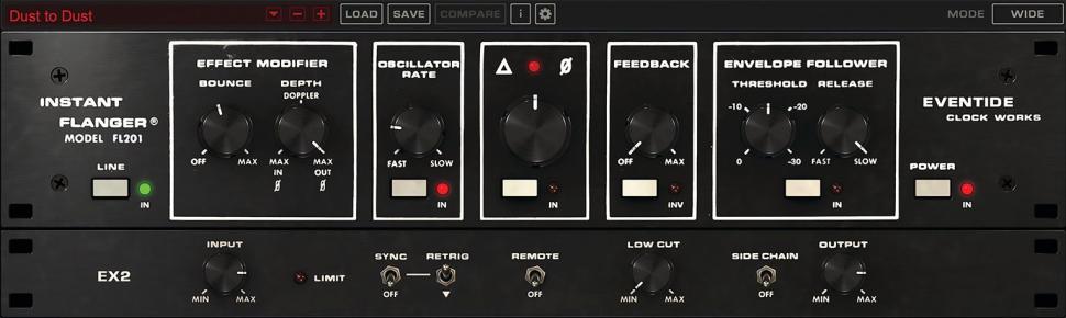 Der Instant Flanger MKII von Eventide ist eine Emulation des Hardware-Originals aus dem Jahr 1975 und dementsprechend ein sehr leicht zu bedienender Flanger-Effekt, der auf eine Eimerkettenspeicher-Schaltung basiert. Von leichten Stereoverschiebungen bis zu drastischen Flanger-Effekten soll das Plug-in eine Menge draufhaben. Es unterstützt die drei Modi Shallow, Deep und Wide sowie eine Bounce-Funktion, die das Draufhalten des Fingers auf dem Band simulieren soll. Das Flanging kann über einen Oszillator oder einen Hüllkurvenverfolger gesteuert werden. Ein Sidechain-Eingang für das Triggern der Hüllkurve ist ebenso am Start. Auf diese Weise kann man den Flanger-Effekt auf einer Gitarre beispielweise durch den Schlag der Snaredrum hochfahren. Eine weitere Kontrollmöglichkeit kann über das Modulations-Rad eines Keyboards erzielt werden, welches dann die Flanger-Intensität via MIDI steuert. Abgerundet wird das Featureset durch einen Feedback-Regler, der den Flanging-Effekt nochmals intensivieren kann.