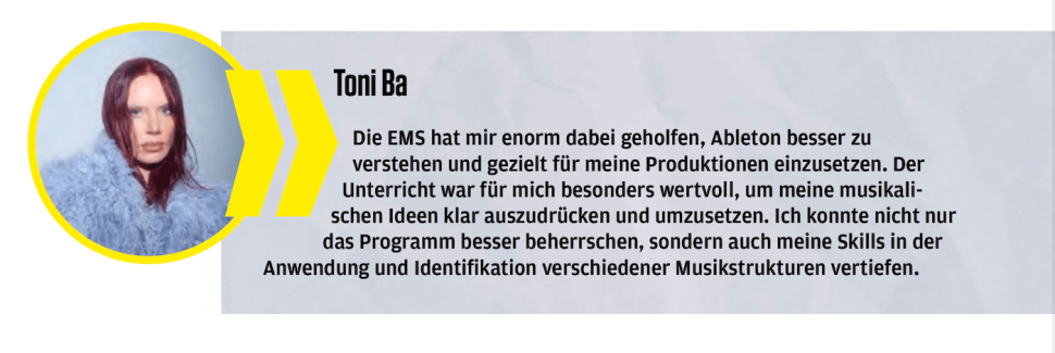 Gleichzeitig fließen die Einflüsse dieser einzigartigen Szene direkt in unsere Kurse ein – sei es durch Dozenten, die selbst tief in der Clubkultur verwurzelt sind, oder durch exklusive Einblicke in die Mechanismen der Szene und der Branche.