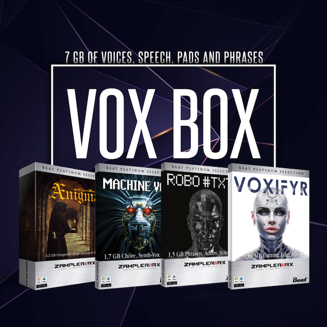 ZamplerSounds hat die VOX BOX veröffentlicht, eine Sammlung von vier Soundbänken mit extravaganten Vocals, Roboter-Phrasen, Mantras, atmosphärischen Formant-Pads, elektronischen Mönche, echten und und synthetischen Chören. Die VOX BOX enthält 187 Patches und 40 Loops mit Stimmen, Flüstern, elektronischen Mönchen, echten und synthetischen Chören, die sich perfekt für Deephouse, Ambient, Chillout und andere Stile eignen, die einzigartige Vocals brauchen.