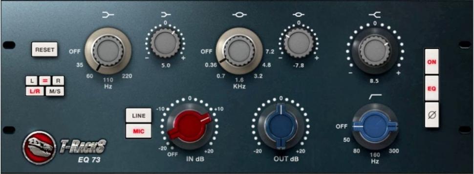 Die Optik des EQ 73 wurde in weiten Teilen der Hardware nachempfunden. In einigen Punkten gibt es zugunsten einfacher Bedienung und erhöhtem Funktionsumfang aber auch Abweichungen. Die Vorverstärkersimulation bietet Mikro- und Line-Modi. Sie dient neben einfachen Pegelanhebungen auch der Sättigung von Signalen, virtuelle Instrumente lassen sich bereits an dieser Stelle durch eine ordentliche Portion pseudo-analogen Charme aufwerten. Die EQ-Sektion verfügt über Shelving-Bänder für Höhen und Tiefen sowie ein Mittenband mit Glockencharakteristik. Tiefen und Mitten sind semi-parametrisch ausgelegt, allerdings stehen, wie vom 1073 gewohnt, bei den Frequenzen nur vier beziehungsweise sechs Festwerte bereit. Im Betrieb stört dieser Umstand jedoch nicht, zumal sich die gebotenen Optionen als überaus musikalisch erweisen. Des Weiteren sind noch ein Hochpassfilter mit vier Eingriffsfrequenzen und ein Schalter zur Phasendrehung an Bord. Als wichtigste Ergänzung gegenüber der Hardware bietet der Entzerrer neben einem L/R-Modus ferner eine M/S-Betriebsart an.