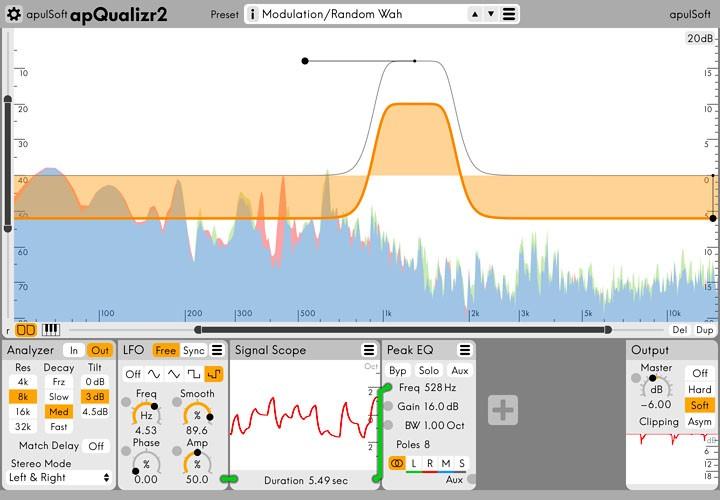 ApulSoft apQualizr2 ist eine Neuausgabe des Multiband-Equalizers, die jetzt modular aufgebaute Effektketten für die Modulation erlaubt. Genauer gesagt begleitet das Plug-in jedes Band mit einem zoombaren Frequenz-Analyzer unterhalb der Frequenzkurve, der anschließend mit einer Modulkette bearbeitet werden kann. Aktuell stehen LFO- und Dynamik-Module sowie Mix- und Splitt-Möglichkeiten zur Auswahl.