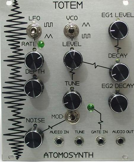 Totem besitzt einen analogen Oszillator mit Dreieck- und Rechteckwellen, die zusätzlich von einem Rauschgenerator unterstützt werden. Ein LFO mit den gleichen Wellenformen lässt sich zudem mit den Parametern Rate und Depth steuern. Ein Hüllkurven-Generator mit den Parametern Decay und Level nimmt sich den Oszillator vor, eine andere Hüllkurve nur mit Decay-Kontrolle steuert den Verstärker (VCA). Ferner ist die Modulation durch die Eingänge Audio, Gate und Tune möglich, ein Audio-Ausgang ist ebenfalls gegeben. CV-Anschlüsse zur Steuerung mehrerer Parameter sind leider nicht vorhanden.