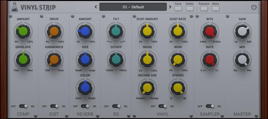 Als Kompressions-Effekt genutzt, kann der Nutzer die Intensität und die Wirkungs-Geschwindigkeit einstellen, beim Verzerren werden die Drive-Steuerung und die Regulierung der Harmonischen ermöglicht. Hinter dem Tilt-EQ verbergen sich zwei Shelf-Filter, deren Frequenz-Zentrum sich mit einem Cutoff-Regler bestimmen lässt. Wird die Tilt-Steuerung gegen den Uhrzeigersinn gedreht, werden die Tiefen abgesenkt und die Höhen betont (und umgekehrt). Abgerundet wird Vinyl Strip mit einer Vintage-Reverb-Einheit und einem Bitcrusher-Effekt, der als Sampler bezeichnet wird.