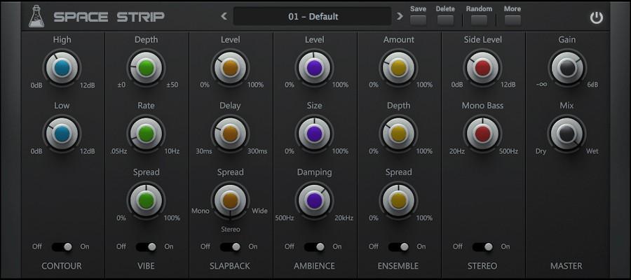 Space Strip ist ein Multi-Effekt bestehend aus sechs Modulen, die sich per Drag & Drop in beliebiger Reihenfolge kombinieren lassen. ''Contour'' ist ein 2-Band-Equalizer, der sich mit max. 12 dB-Boost um die Tiefen und Höhen kümmert, während ''Vibe'' den Vibrato-Effekt inklusive Panorama-Steuerung generiert. Weiter geht's mit ''Ambience'' - dem Hall-Effekt, der die Hallfahnen-Dauer und die Frequenz-Dämpfung als Steuer-Instanzen bietet. Der Delay-Effekt wird hier als ''Slapback'' bezeichnet, während ''Ensemble'' für den mehrstimmigen Chorus steht. Abgerundet wird das Featureset mit dem Parameter ''Stereo'', der neben der Bass-Schwelle einen Side-Gain für mehr Breite bietet.