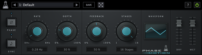 Hinter dem vielversprechenden Namen verbirgt sich ein Phaser-Plug-in, das dabei helfen möchte, statischen Sounds mehr Leben zu verleihen. Bei diesem Effekt werden mithilfe einer Serie von Allpassfiltern Phasenverschiebungen erzeugt. Wenn man diese moduliert und das bearbeitete Signal dem Original beimischt, entsteht charakteristische Auflöschungen und damit ein lebendiger und manchmal auch nasaler Klang. Phase Motion arbeitet mit bis zu 16 Stufen (Anzahl der Allpassfilter), die sich unterschiedlich stark und schnell modulieren lassen. Da das Tempo zur Host-Geschwindigkeit synchronisiert werden kann, lassen sich rhythmische Effekte erzielen. Modulationstiefe und Feedback können dabei ebenfalls in einem großen Bereich eingestellt werden. Die fünf Wellenformen des LFOs bringen den Effekt nochmals richtig auf Touren. Für das nächste Update hat der Hersteller bereits langsamere LFO-Raten sowie weitere Wellenformen angekündigt. Im Test machte das Kreativwerkzeug besonders auf Beats, E-Pianos, Flächensounds oder auch Gitarrenaufnahmen eine gute Figur. Dank der wenigen Parameter gelangen Laien wie auch Profis schnell zu interessanten Ergebnissen. Der Zufallsgenerator liefert schnell neue Inspirationen.