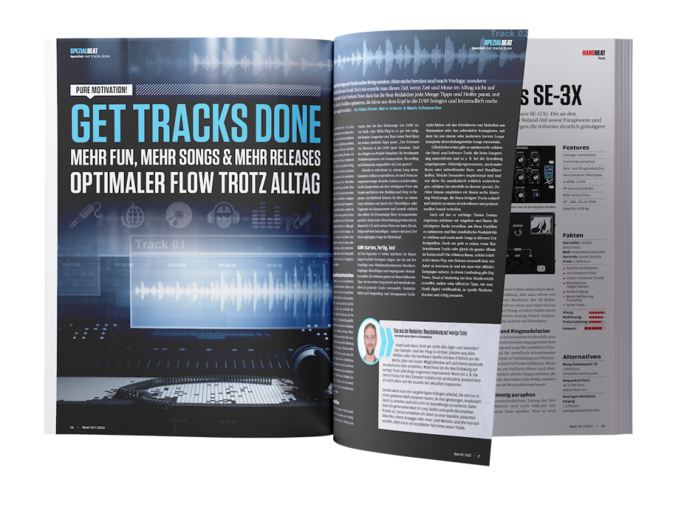 Das Ziel ist klar: Mehr Songs und Tracks sollen fertig werden. Aber nicht herzlos und nach Vorlage, sondern ausgefeilt und mit Liebe zum Detail. Doch wie erreicht man dieses Ziel, wenn Zeit und Muse im Alltag nicht auf Knopfdruck mitspielen? Kein Problem! Denn dazu hat die Beat-Redaktion jede Menge Tipps und Helfer parat, mit denen Sie Ihren Studio-Workflow optimieren, die Ideen aus dem Kopf in die DAW bringen und letztendlich mehr Projekte Release-tauglich machen. Jetzt in Beat 02/22 im Falkemedia-Shop kaufen.