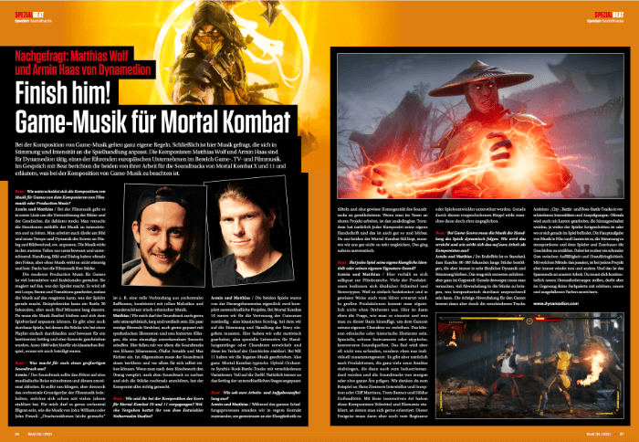 Bei der Komposition von Game-Musik gelten ganz eigene Regeln. Schließlich ist hier Musik gefragt, die sich in Stimmung und Intensität an die Spielhandlung anpasst. Die Komponisten Matthias Wolf und Armin Haas sind für Dynamedion tätig, eines der führenden europäischen Unternehmen im Bereich Game-, TV- und Filmmusik. Im Gespräch mit Beat berichten die beiden von ihrer Arbeit für die Soundtracks von Mortal Kombat X und 11 und erläutern, was bei der Komposition von Game-Musik zu beachten ist.