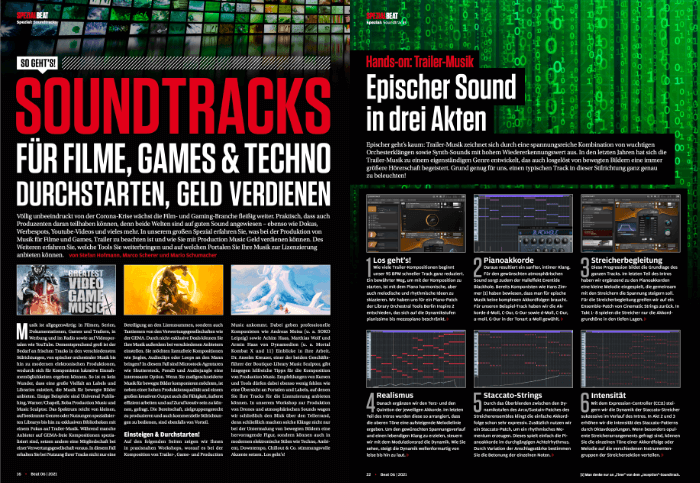 Völlig unbeeindruckt von der Corona-Krise wächst die Film- und Gaming-Branche fleißig weiter. Praktisch, dass auch Produzenten daran teilhaben können, denn beide Welten sind auf guten Sound angewiesen – ebenso wie Dokus, Werbespots, YouTube-Videos und vieles mehr. In unserem großen Spezial erfahren Sie, was bei der Produktion von Musik für Filme und Games, Trailer zu beachten ist und wie Sie mit Production Music Geld verdienen können. Des Weiteren, welche Tools Sie weiterbringen und auf welchen Portalen Sie Ihre Musik zur Lizenzierung anbieten können. Jetzt lesen: www.bit.ly/BeatMagazin
