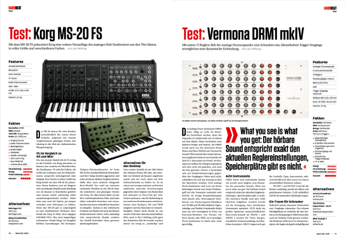 Im Test stellen sich Korg’s Neuauflage des Korg MS-20, Vermona’s DRM1 Update Nummer IV, der SKULPTsynthSE von Modal Electronics, das MOTU UltraLite mk5 und Mackie EM-Chromium, sowie die Software-Highlights Tone2 Nemesis 2, Algonaut Atlas 2 und viele weitere Hard- und Softwareprodukte der Redaktion.