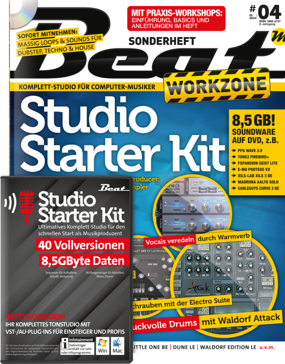 Nie war der Aufbau eines Musikstudios einfacher, der erfolgreiche Einstieg als Komponist, Musiker oder Produzent leichter und preiswerter als heute. Denn die Beat-Redaktion hat im aktuellen Sonderheft „Beat Workzone – Studio Starter Kit“ nicht weniger als ein komplettes virtuelles Studio auf die DVD gepackt.