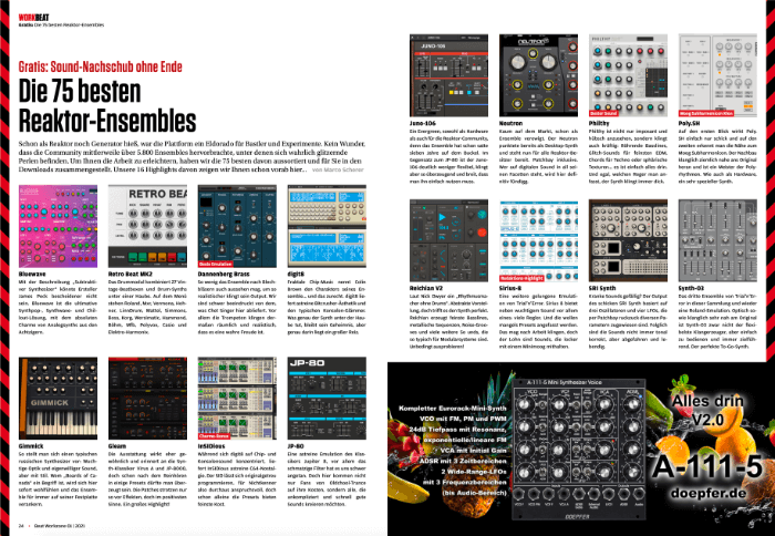 Schon als Reaktor noch Generator hieß, war die Plattform ein Eldorado für Bastler und Experimente. Kein Wunder, dass die Community mittlerweile über 5.800 Ensembles hervorbrachte, unter denen sich wahrlich glitzernde Perlen befinden. Um Ihnen die Arbeit zu erleichtern, haben wir die 75 besten davon aussortiert und für Sie in den Downloads zusammengestellt. Unsere 16 Highlights davon zeigen wir Ihnen schon vorab hier...