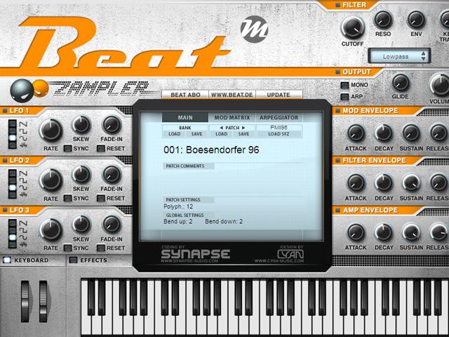 Mit dem „Zampler“ bringt Beat eine professionelle Sample-Workstation für Windows und OS X auf den Markt, die in Bezug auf Klang und Ausstattung locker mit den Großen der Branche mithalten kann. Das Plug-in ist für die VST- und AU-Schnittstelle erhältlich und begeistert mit einer durchdachten Ausstattung. Neben SFZ-fähigen Sample-Oszillatoren bietet der Zampler eine Klangformung vom Feinsten: Im integrierten Multimode-Filter stehen die Typen Tief-, Hoch-, Bandpass und Bandsperre sowie verschiedene Kombinationen daraus zur Auswahl.