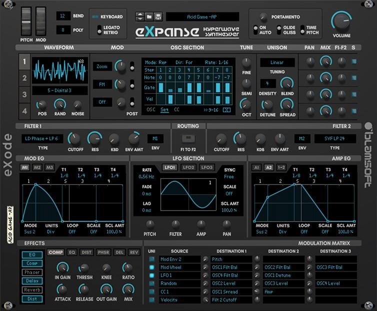 Den Kern von Expanse bilden vier Oszillatoren, die zusätzlich mit Wellenform-Modifikatoren, einer additiven Engine und modernen Unisono-Modi unterstützt werden. Die Klangerzeugnisse aller Oszillatoren werden in zwei Parallel-Signale gegossen, die weiter den parallelen oder seriellen Weg via zwei Multimode-Filter (29 Typen!) finden. Als Modulations-Ressourcen finden sich fünf graphische Hüllkurven und drei LFOs (64 Wellenformen!), eine Modulations-Matrix mit allen denkbaren Zielen ist ebenfalls an Bord. Die integrierte FX-Abteilung inklusive sechs Effekten kann auch externe Signale veredeln. Zu guter Letzt ist ein Sequenzer mit dabei, der unterschiedliche Patterns zu generieren vermag.