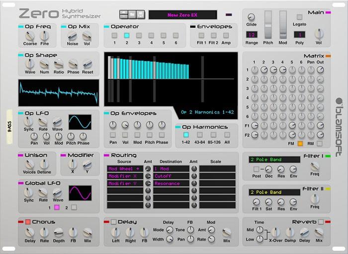 An erster Stelle bietet Zero eine moderne FM-Synthese anhand sechs Operatoren, die variable Wellenformen generieren, einander gegenseitig modulieren und somit nahezu unendliche Möglichkeiten der Soundgebung darstellen. Neben der Frequenz-Modulation (FM) wurde Zero auch mit der Fähigkeit zur Ring-Modulation (RM) und der additiven Synthese ausgestattet, zur Kontrolle und Anpassung gibt es eine flexible Modulations-Matrix, dedizierte LFOs, Hüllkurven und Oberton-Aufwerter (Harmonics). Ferner offeriert der Hybrid die klassische subtraktive Synthese, hierzu sind zwei Filter mit je 16 Modi inklusive Zero-Delay-Feedback-Technologie mit an Bord. Zwei Globale LFOs, Routing-Möglichkeiten, Unisono-Modus sowie die Effekte Chorus (im Stil von Roland Dimension D), Delay und Reverb vollenden den Signalweg. Abgerundet wird das üppige Ganze noch mit 300 Presets, die den Anwender EDM-Sounds, aggressive Bässe und satte Pads versprechen.