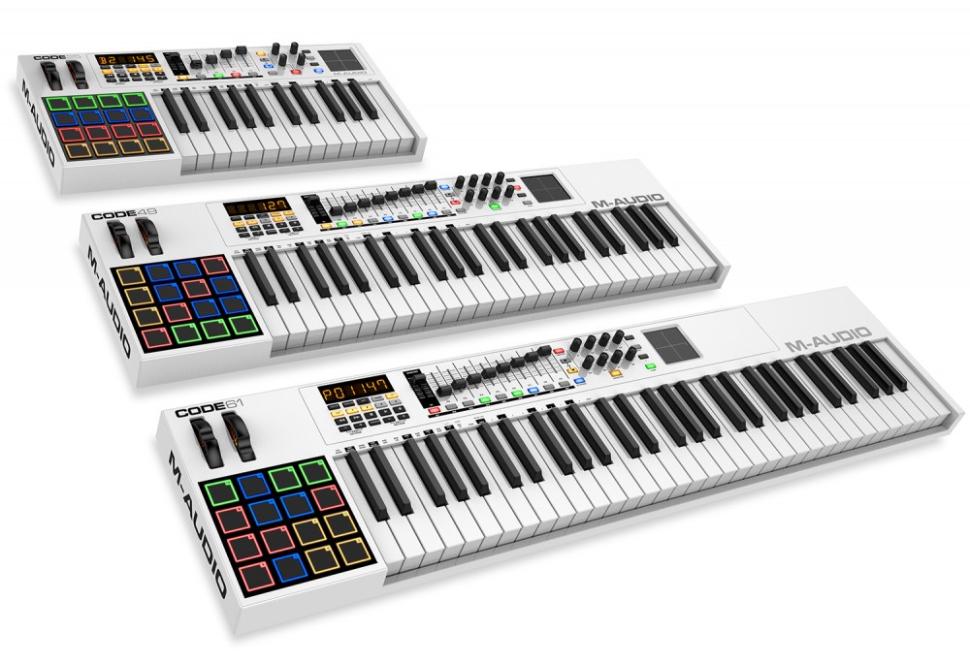 M-Audio hat für die NAMM eine neue Keyboard-Controller-Linie mit der Bezeichnung Code vorbereitet. Drei Modelle sind enthalten, sie unterscheiden sich in erster Linie durch ihre 25, 49 oder 61 leicht-gewichteten Tasten. Beim kleinsten Modell wurde zusätzlich die Auswahl an Bedienelementen zusammengestrichen. Alle Klaviaturen besitzen Anschlagdynamik und Aftertouch, mittels Split-Funktion kann man sie in bis zu vier Zonen aufteilen. Speziell für Schlagwerk wurden 16 ebenfalls anschlagsensitive Pads integriert. Die Bedienelemente setzen sich, je nach Modell, aus Pitch- und Mod-Rädern, vier bis acht Fadern, fünf bis neun Drehreglern, einem X/Y-Feld und einer üppigen Auswahl an Tastern zusammen. Sämtliche Komponenten sollen von aktuellen DAWs automatisch erkannt und zugewiesen werden.