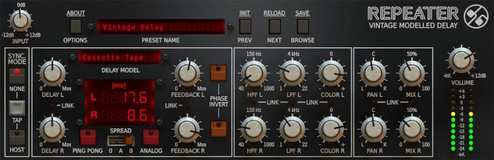 Repeater ist ein Dual-Echo inklusive der Emulation von ganzen 23 klassischen Hardware-Effekten, darunter Eimer-Ketten- und Platten-Geräte wie auch Vintage-Digitalboliden. Insgesamt zwei unabhängige Delay-Signalwege können für spektakuläre Echo-Effekte genutzt werden. Neben Filtern, einem Audio-Clipper und einer Phasen-Umkehr sind pro Kanal auch ein Dry/Wet-Parameter sowie ein Kanal-Re-Panning vorzufinden. Ping-Pong-Modus, Feedback-Loops und eine interne 64-Bit-Verarbeitung sind ebenfalls dabei.