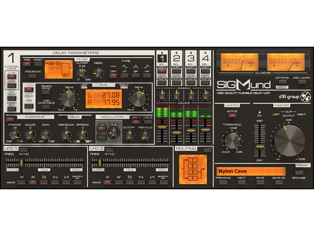 Der neueste Streich der polnischen Softwareschmiede D16 ist nicht etwa ein neuer Klon der TR-Serie, sondern widmet sich der Erweiterung der hauseigenen Effekt-Palette. So ist Sigmund ein flexibles Delay mit vier unabhängigen Verzögerungsschleifen. Jede davon besitzt einen eigenen variablen Filter, Overdrive und kann per LFO moduliert werden. Das Routing der Delays lässt sich ebenfalls nach Belieben anpassen. Per Limiter am Ende der Kette werden Übersteuerungen verhindert und der Sound aufgepumpt.