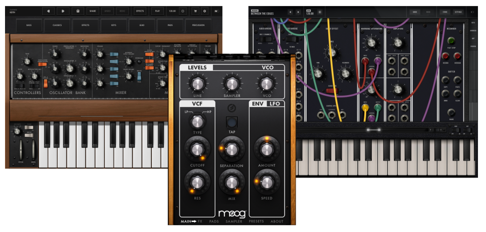 Der Model 15 Modular Synthesizer erlaubt das direkte Patchen mit virtuellen Kabeln, und verfügt neben den Oszillatoren und dem 904A Tiefpassfilter, auch über den 1150 Ribbon-Controller. Außerdem besitzt er wie auch die Minimoog Model D-App über 160 Presets. Ein Arpeggiator, Ping-Pong-Delay und Bending Modulationseffekt erweitern die gewohnte Ausstattung des Minimoogs. Filtatron hingegen ist eine Effektapp, die einen eigenen Oszillator einsetzen kann, alternativ aber auch als Signalquelle den Import von Samples gestattet. Seine Multi-Touch X-Y-Pads und Effekt-Module sind vor allem für Live-Performances empfehlenswert.