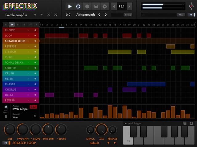 Breaks, Fill-Ins, Stakkato-Vocals oder gleich komplette Grooves erzeugen sind einige der Gebiete, in denen Effectrix zuhause ist. Insgesamt 14 Effekte werden via Sequenzer perfekt getimed abgefeuert und reichen von vornehm inszenierten Standards bis hin zu verstörenden Splatterorgien. Neben dem klassischen Loopen von Passagen in Echtzeit, können Loops mit Effectrix gescratcht, gestretcht, umgekehrt oder in Looplänge und Pitch moduliert werden. Mit dem Tonal Delay lassen sich aus beliebigem Material Melodien zaubern. Der Stutter Effekt bietet klassisches Gating, sowie Pan-Modulationen und Transientenbearbeitung. Für die just veröffentlichte iPad Version wurden die Features 1-zu-1 übernommen, während die Optik feingeschliffen wurde.Preis: 16 Euro