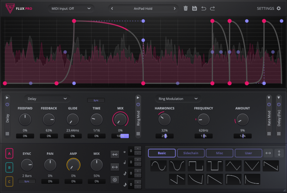 Die grafischen Kurven lassen sich spannungsgesteuert an externe Hardware via CV ausgeben. Als Effektslots gibt es vier Stück, die jeweils aus zehn Effekten schöpfen können. Zur Auswahl stehen zwei Filter, zwei Delays, sowie Width, Phaser, Chorus/Flanger, Rate Modulation, Ring Modulation und Utility. Für den Einstieg stehen bereits 115 Presets bereit. Über One-Shot & Retrigger lässt sich das Plug-in auch über MIDI triggern.