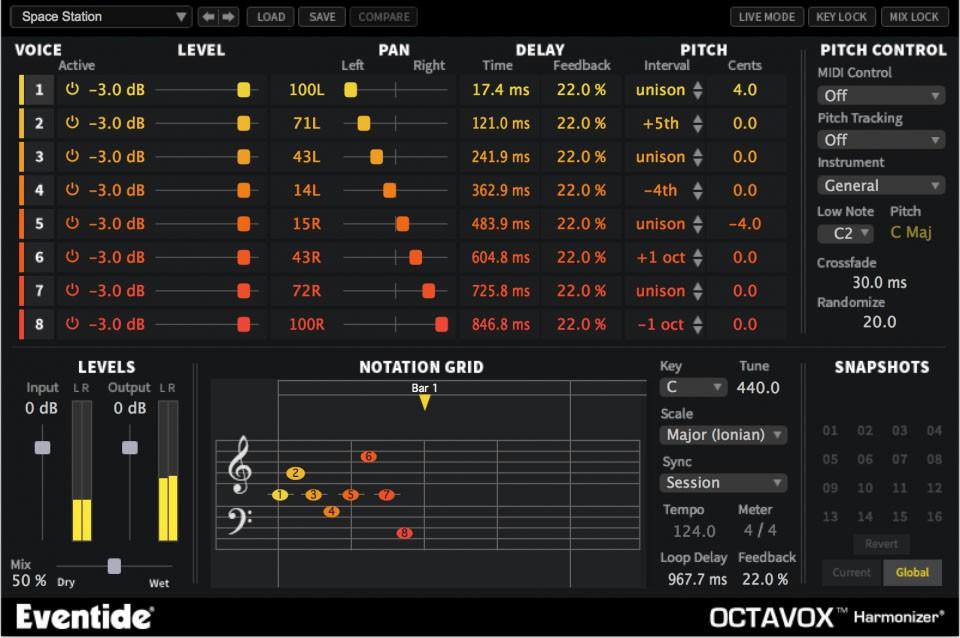 Octavox ist ein virtueller Harmonizer, der das rückgekoppelte Pitch Shifting aus dem hauseigenen Flaggschiff H8000 nachmodelliert. Das Plug-in mit dem zeitbasierten, diatonischen Pitch Shifting inklusive acht Stimmen soll die Harmonien staffeln, Instrumente hervorheben und innovative Rhythmen kreieren können. Der Nutzer kann Skalen und Tonhöhen bestimmen sowie einzelne Stimmen anhand der Parameter Panning, Detune, Delay, Interval und Feedback bearbeiten. Zudem kommt die native Version mit einer erweiterten MIDI-Funktionalität, um das Plug-in auch live einsetzten zu können. Mitgeliefert werden über 70 Presets für verschiedene Instrumente, darunter Synthesizer und Drums.