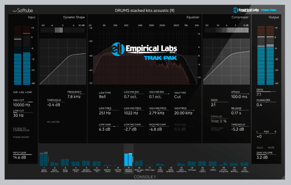 Zur Erweiterung des Mixing-Controllers Console 1 hat Softube das Empirical Labs Trak Pak veröffentlicht. Basierend auf dem von Dave Derr entwickelten Hardware Vorbild von Empirical Labs, wurde ein virtueller Channelstrip erschaffen. Trak Pak umfasst das Filter des Lil FrEQ und den Kompressor Mike-E. Die detailreich und üppig ausgestattete Erweiterung des Lil FrEQ, soll der Charakter eines Neve 1073 nachgebildet werden.