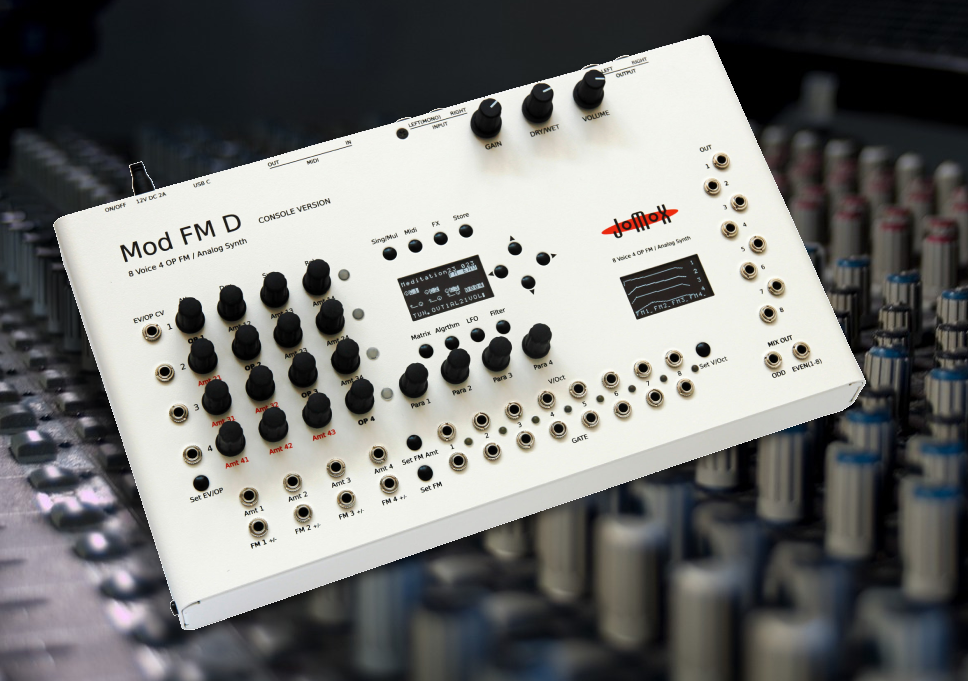 Nachdem Jomox vor einem Jahr das Eurorack-Modul Mod FM veröffentlichte, folgt nun die Desktop-Variante des Synthesizers Mod FM D. Der 8-stimmige FM-Klangerzeuger setzt sich aus vier Operatoren und zwei LFOs/VCOs pro Stimme zusammen. Für jede der Stimme gibt es eigene CV/Gate Eingänge und einen Ausgang. Weitere Anschlüsse sind MIDI In /Out und ein USB-C-Port. Es gibt zwei analoge Filter mit den Modi 24 dB Tiefpass und 12 dB Multimode, die dem Synth analoge Tiefe und Wärme verleihen, auch wenn die FM-Engine digital basiert ist