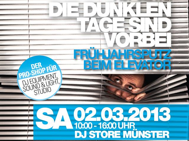 Elevator läutet den Frühling ein und startet eine großangelegte Aufräumaktion. Das bedeutet, es gibt massig Equipment-Schätze aus dem DJ- und Studiobereich zu günstigen Preisen abzustauben. Die Elevator Crew schwingt am Samstag, 02.03.2013 im Elevator DJ Store sowohl Besen als auch den roten Rabattstift: Bis zu 60% Rabatt gibt es auf DJ-Controller, CD-Player, Mixer oder DJ-Zubehör wie Cases und Bags. Auch im Outlet-Bereich wird Platz benötigt, deshalb sind auch Einzelstücke reduziert.