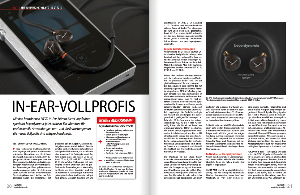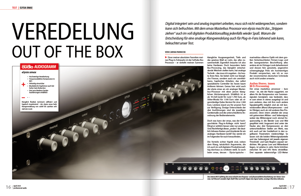und professional audio hält einmal mehr eine Reihe tief greifender Produkttests bereit, die Geräte mit besonderer und bemerkenswerter Ausstattung in den Mittelpunkt stellen. So haben wir uns den Dynamik-Prozessor xmax der deutschen Pro-Audio-Manufaktur elysia näher angeschaut, der das Veredeln von Summensignalen und Stems auf einzigartige Weise realisiert. Mit der Studio Bridge legt Tascam eine Desktop-Recorder- und Audio-Interface-Kombi vor, die zurzeit Seines Gleichen sucht. „24 Kanäle für ein Recording-Halleluja“ lautet dabei das Motto. Ein weiteres Highlight sind die neuen In-Ear-Hörer aus beyerdynamics DT-Serie, die auf spezielle Abhörsituationen und Instrumentengruppen abgestimmt sind. Einmal mehr ist es ein Faszinosum, wie der Traditionshersteller aus Heilbronn es schafft, so viel ausgeklügelte Technik auf so kleinem Platz unterzubringen. Das alles und noch viel mehr gibt es in der zweiten Ausgabe 2025 von professional audio zu entdecken.