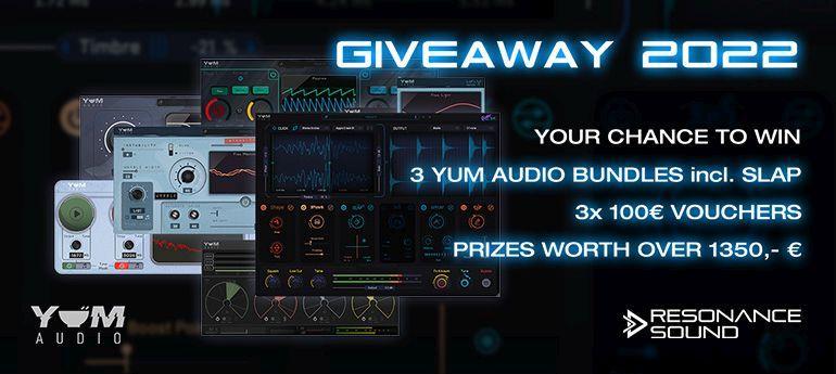 Mit dem Giveaway 2022 hat Resonance Sound auch dieses Jahr wieder ein fettes Gewinnspiel auf die Beine gestellt, bei dem Preise im Wert von über 1350 Euro verlost werden. Im Vordergrund steht diesmal das „Yum Audio-Special“, in dem die Plug-ins von Yum-Audio aber auch Gutscheincodes für Sample-Produkte von Resonance Sound verlost werden.