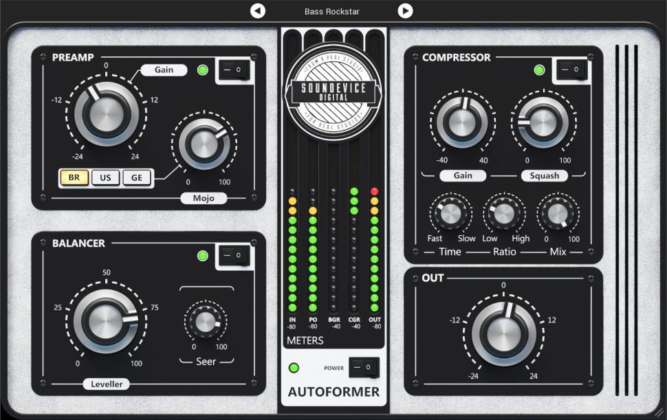 Mit den Buttons BR, US, GE lässt sich am Preamp die Klangfarbe British, Amerikanisch oder Deutsch simulieren. Mojo bestimmt die Intensität der Klangfärbung. Das Eingangssignal kann via Input um 24 db verstärkt werden. In der Balancer-Sektion kann definiert werden ab welchem Pegelwert das Plug-in automatisch den Pegel steuern soll. Der Compressor verfügt über die üblichen Parameter wie Gain und Ratio. Fünf Meter geben die visuelle Kontrolle über die Pegel-Reduktion, sowie Ein- und Ausgangslautstärke. Mehrere Presets sind inklusive.