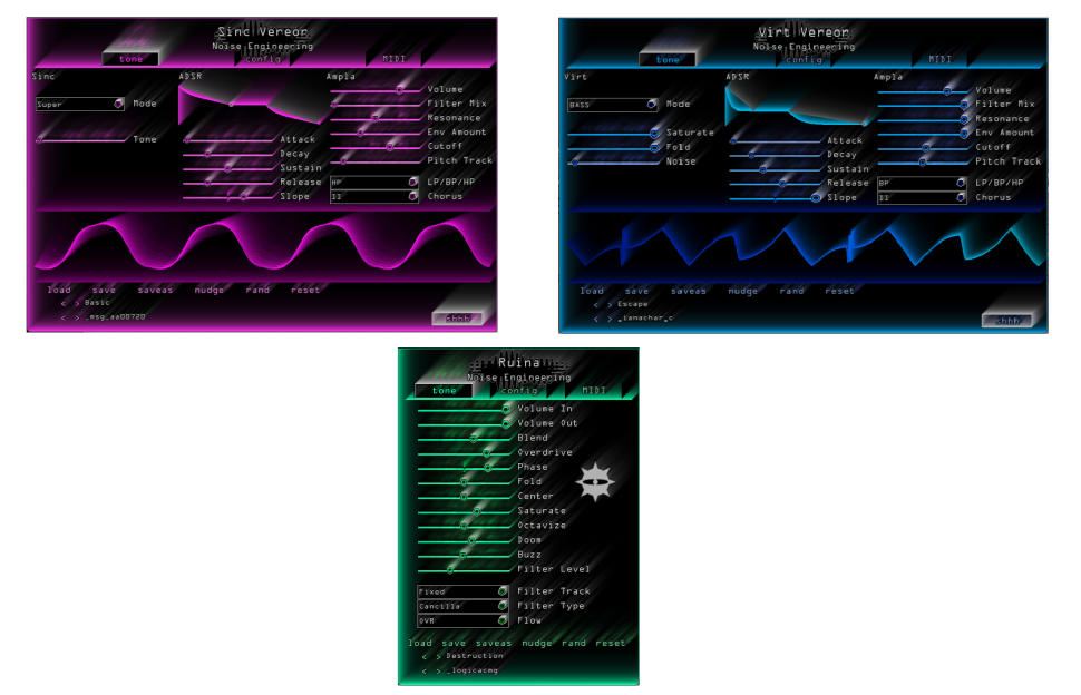 Als Effekt gibt es einen Chorus. Bis auf die Sättigung finden sich auch die Elemente im Wavefolding-Synthesizer Sinc Vereor. Er erlaubt das Morphen zwischen den sechs Wellenformen Sägezahn, Dreieck und Rechteck. Ideal für perkussive und Noise-Klänge, sowie Soundeffekte. Das dritte Plugin Ruina, ist ein vielseitiger Stereo-Sättiger und Verzerrer, mit dem das Eurorack-Modul Ruina Versio emuliert wird. Er verfügt auch über eine Filtereinheit.