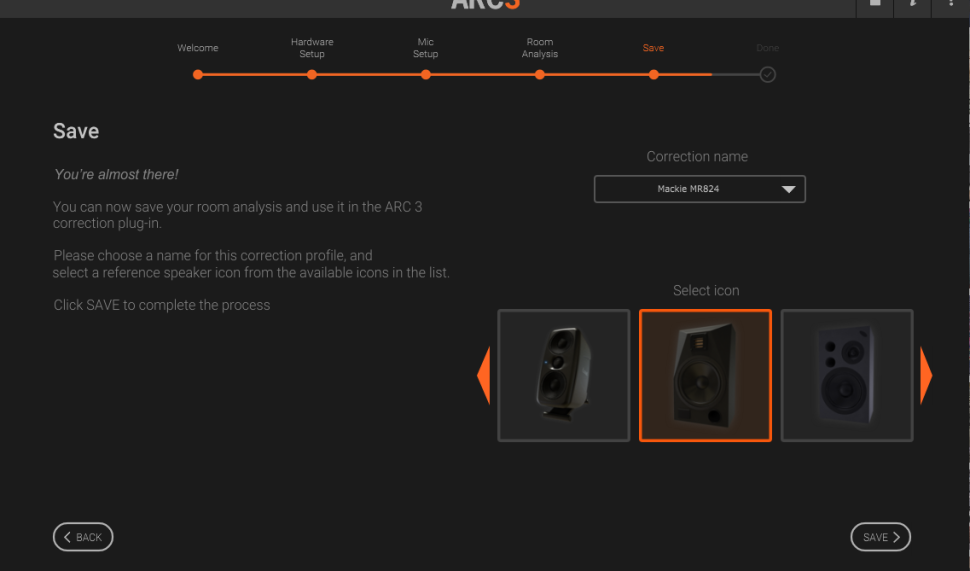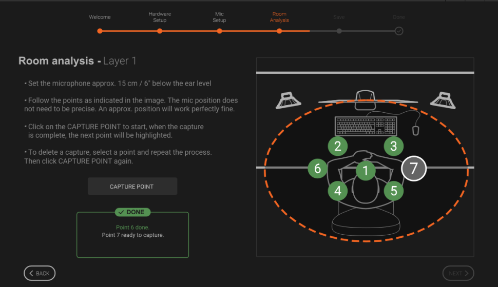 Wählen Sie eine Hörumgebung, die am Besten zu Ihrem Studiotyp passt. Ein Desktop-Studio mit den Boxen im direkten Nahfeld erfordert andere Einstellungen als ein Aufnahmeraum mit großem Mischpult und darauf platzierten Midfield-Monitorboxen. Folgen Sie den Anweisungen in der Software zur korrekten Positionierung und Einpegeln von Mikrofon und Abhöre.