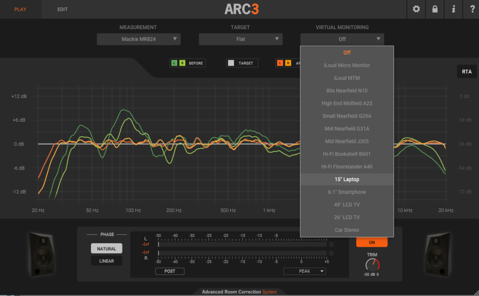 Im Menü MEASUREMENT wählen Sie das von Ihnen in den vorigen Schritten erstellte Profil aus. VIRTUAL MONITORING ermöglicht statt einer linearen Idealfrequenzkurve die Simulation des Klanges von Abhören wie Laptop, Smartphone oder Hifi-Boxen. So können Sie ausprobieren, wie Ihr Mix im Auto, auf dem Smartphone oder im Wohnzimmer klingen würde.
