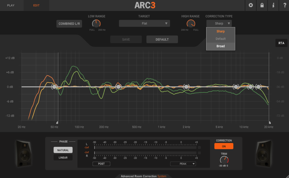 Das Plug-in erlaubt noch weitere Anpassungen an Ihre Hörgewohnheiten. Mit Correction Type bestimmen Sie, wie stark die Software den Klang von Boxen und Raum in Richtung linearer Frequenzgang korrigieren soll. Mit den beiden Reglern für Low- und High-Range schneiden Sie Frequenzbereiche aus, falls Sie nur Bässe oder Höhen korrigieren wollen.