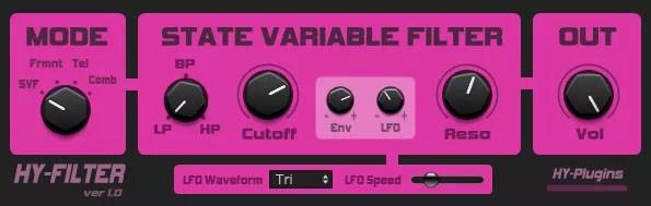 HY-Filter stellt vier Filter-Modi bereit, die jeweils über dedizierte Parameter verfügen. Den Anfang macht das State Variable Filter (SVF), das neben den Charakteristiken Hoch-, Tief und Bandpass auch eine Cutoff- und Resonanz-Steuerung bietet. Zudem sind ein LFO und ein Hüllkurven-Verfolger an Bord, um den Cutoff zu beeinflussen. Die zweite Filtereinheit nennt sich ''Formant'' und nimmt die Kontrolle über Resonanzspektren der menschlichen Stimmen. Hier können sechs vorgegebene Vokale geschliffen werden, neben LFO und Envelope Follower sollen die Parameter ''Q'' und ''Smth'' für Charakter und Weichheit der Frequenzübergänge sorgen. Weiter geht es mit dem Filtertyp ''Telephone'', der mit Geräuschen und akustischem Schmutz Telefonleitungen simulieren will. Zu guter Letzt steht das Comb-Filter inklusive Delay, Feedback und Tonalität zur Verfügung, mit dem Ziel bei Drum-Sounds eine gute Figur zu machen.