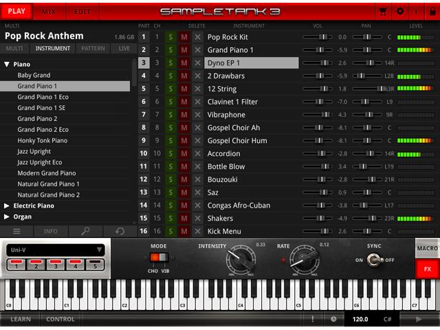 Sounds satt könnte das Motto des aktuellen SampleTank Updates lauten. Über 4.000 Presets aller Couleur, angefangen von Band Instrumenten über komplette Orchester bis hin zu elektronischen Drumkits, teilen sich 33 GB auf der Festplatte. Wie gehabt ist das Plug-in 16-fach multitimbral, doch wurde an der Optik gefeilt. Patch-Browser, Mixer und die Edit Sektion sind nun auf drei Seiten verteilt, was für mehr Übersicht sorgen soll.