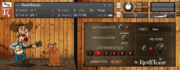 Wer gerne einmal ein Banjo in seine Produktionen einbauen möchte, sollte sich einmal das RealiBanjo von RealiTone ansehen. Das nur 191 MB kleine Kontakt-Instrument bietet zwei Artikulationen an: Zum einen ist RealiBanjo mit einem Pattern-Player mit sechs vorgefertigten Styles versehen. Diese sind in der Oktave über C2 per Key-Switch aktivierbar, außerdem stehen eine Humanize- und eine Swing-Funktion sowie Buttons zum Halbieren/Verdoppeln des Tempos zur Verfügung. In den obersten beiden Oktaven (ab C6) werden die Akkorde gegriffen, das Instrument versteht Dur-, Moll-, (Dur-)Sept-, Moll-Sept- und Sus4-Akkorde. Wer selbst in die Saiten greifen will, dem steht der Tastenbereich zwischen C3 und H5 fürs Single-Note-Spiel zur Verfügung. Hier kann die (auch per Key-Switch aktivierbare) Auto-Legato-Funktion für mehr Realitätsnähe sorgen: Das Skript erkennt Legato gespielte kleine und große Sekunden und kreiert daraus ein Hineinrutschen in die zweite Note (Slide).