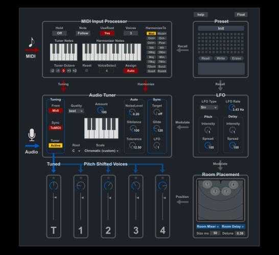 Zunächst einmal kümmert sich das Tool um die menschliche Stimme, indem Vocal-Spuren in der Tonhöhe automatisch korrigiert werden können (Auto-Tuning). Dazu akzeptiert die Anwendung Signale über MIDI, Tastatur-Eingaben oder vorsequenzierte Abschnitte, um Tonhöhen-Manipulation und Harmonisierung (bis zu vier Stimmen) zu realisieren. Tuning, Vocoding oder die Anreicherung mit Harmonischen können zudem simultan in Echtzeit stattfinden.