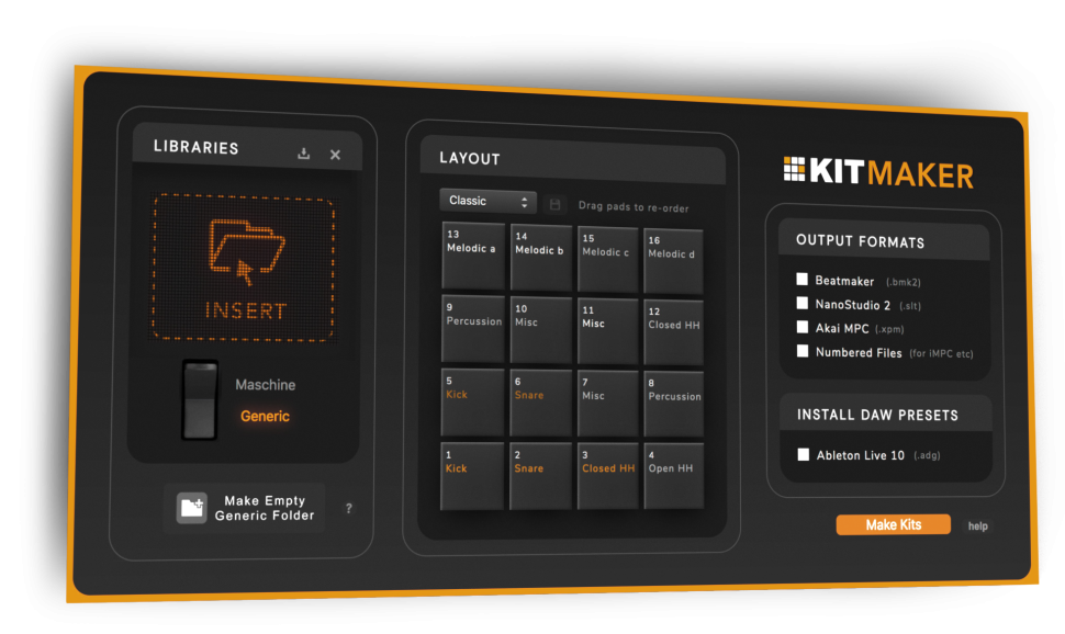 Kit Maker konvertiert wahlweise beliebige Ordner mit Samples zu Kits in diversen Formaten oder aber auch Maschine Libraries. Ebenso ist es möglich, alle Drums der kompletten Factory Library von Maschine in einem Rutsch umzuwandeln. Unterstützt werden die Formate Ableton Live 10 Drumrack, Beatmaker 3 (iOS), iMPC Pro 2 (iOS), Nanostudio 2 (iOS), sowie die MPC Modelle X, Live, One, Software und Akai Force. Alternative kann Kit Maker auch nummerierte Samples ausgeben, die sich dann in jeden beliebigen Drumsampler laden lassen.
