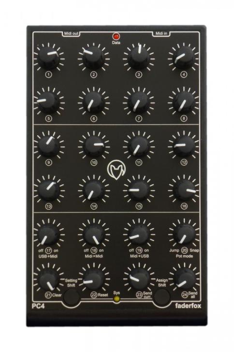 Der Faderfox PC4 ist ein USB-/MIDI-Controller mit 24 Potis, der im robusten Kunststoffgehäuse untergebracht ist. Für den Austausch von MIDI-Daten oder zur Reihenschaltung mehrerer Faderfox-Geräte gibt es zwei MIDI-Buchsen im Miniklinkenformat, für deren Nutzung Adapterkabel oder spezielle MIDI-Kabel benötigt werden.