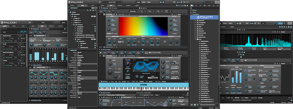 Falcon 2.5 ist dazu fähig Soundquellen, seien sie samplebasiert oder durch Synthese generiert miteinander zu kombinieren und zu mischen. Zur Auswahl an Synthese-Oszillatoren stehen analog, Wavetable, Phasenverzerrung, FM und Typen der additiven Synthese, als auch Physical Modeling. Mehr als 90 hochwertige Effekte sorgen für die Klangveredelung. Diverse Modulationsgeneratoren sorgen für die Lebendigkeit und Variationen im Sound.