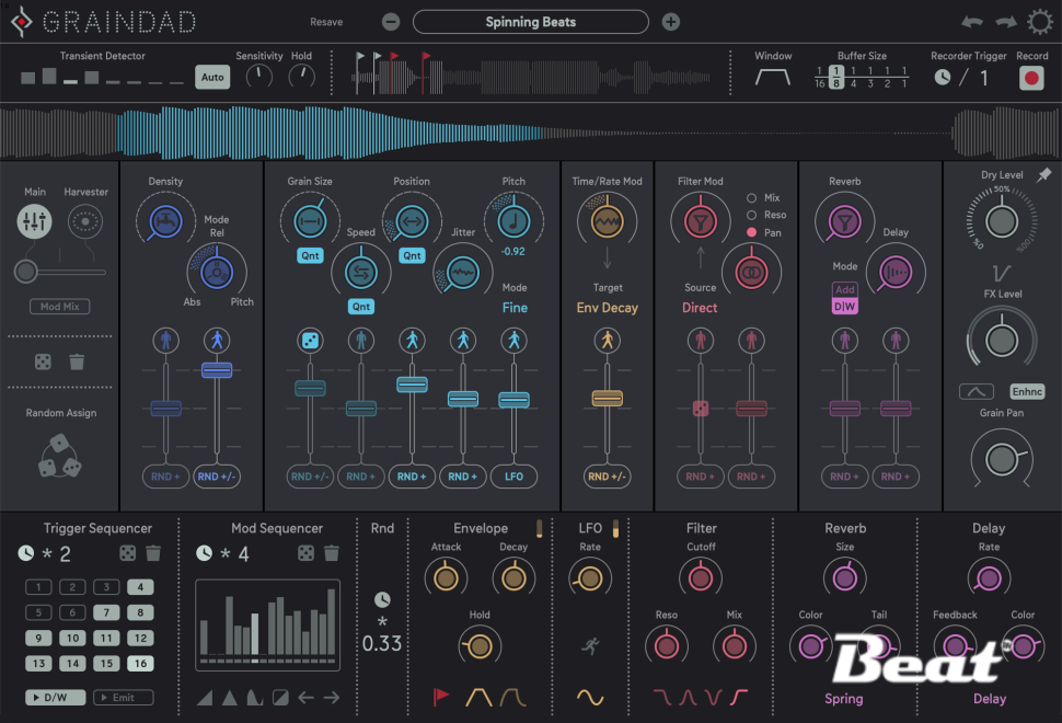 Sugar Bytes veröffentlicht mit Graindad einen vielversprechenden Granulareffekt. Das Plug-in dürfte vor allem für experimentelle und kreative Sounddesigner interessant sein. Es können maximal 64 Audiofragmente (Grains) generiert werden. Als Filtertypen stehen Lowpass, Highpass, Bandpass und Band Reject zur Auswahl.