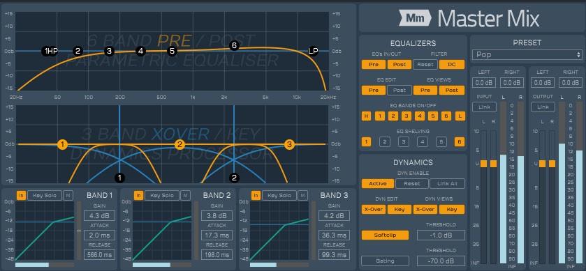 Mit Master Mix bietet TSC, der Hersteller der DAW Tracktion, ein kostengünstiges Multi-Band-Dynamik- und Equalizer-Tool an, das Sie über den firmeneigenen Marketplace beziehen können. Die Bedienoberfläche will erst einmal erobert werden, denn in kleinem Schriftgrad sind sehr viele Elemente untergebracht. Links oben finden Sie die beiden Equalizer-Module, eines davon befindet sich im Signalweg vor dem Multibandkompressor, das andere dahinter. Die Entzerrer sind mit sechs voll-parametrischen Mittenbändern sowie Hoch- und Tiefpass ausgestattet. Ein Doppelklick in einen freien Bereich des EQ-Fensters öffnet die Parameterübersicht, die genaue Einstellungen erlaubt pfiffig! Einen Spektrum-Analyzer gibt es nicht, dafür können Sie alle Bänder einzeln aktivieren und auf Shelf umschalten.