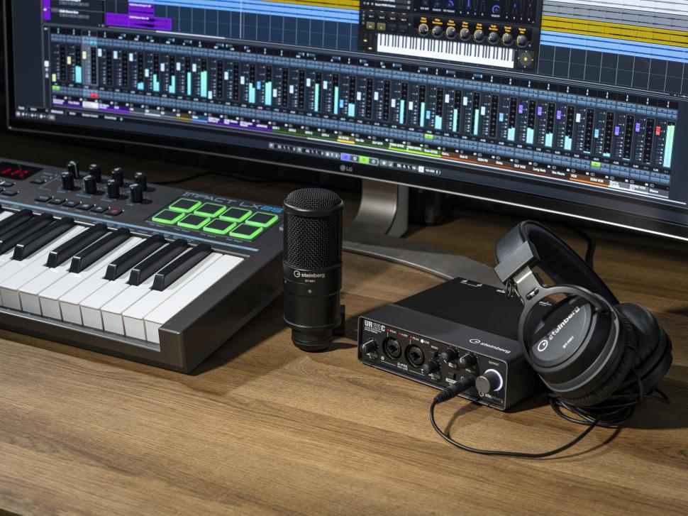 Mit seinem Production Starter Kit hat Steinberg ein Komplettset für die Musikproduktion geschnürt. An Bord sind das MIDI-Controller-Keyboard Nektar Impact LX25+, Steinbergs beliebtes Audio-Interface UR22C USB 3.0, das Studio-Kondensatormikrofon ST-M01, der Studio-Kopfhörer ST-H01 sowie ein hochwertiges Software-Bundle. Dieses besteht aus Cubase Artist, HALion Sonic, WaveLab und der App Cubasis LE – damit ist also alles an Bord, was für den Einstieg in die Musikproduktion nötig ist. Das Kondensatormikrofon ist solide verarbeitet und deckt einen weiten Frequenzbereich ab. Das Audio-Interface versorgt das Mikrofon dabei mit der nötigen Phantomspeisung und überträgt das Signal in 32-Bit/192-khZ-Qualität in Ihre DAW. Wer auf die Software und das MIDI-Keyboard verzichten kann, findet in dem Steinberg UR22C Recording Pack eine günstige Alternative.