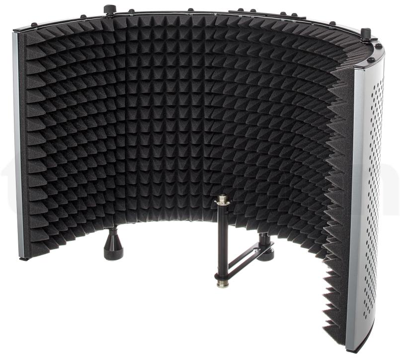 Wer im heimischen Studio schon einmal Gesang oder Instrumente aufgenommen hat, weiß: Der Nachhall des Aufnahmeraums ist meist deutlich zu hören, ebenso wie störende Geräusche wie das Rauschen des PC-Lüfters. Hier schaffen kompakte Mikrofonabsorber Abhilfe. Der t.bone MicScreen XL besitzt fünf Segmente, die sich in verschiedenen Positionen auf- und zuklappen lassen. Je weiter die Flügel dabei nach innen zeigen, also das Mikrofon umschließen, desto weniger Raumanteile werden von ihm eingefangen. Der transportable Absorber und Diffusor lässt sich auf einem Stativ montieren oder direkt auf der Tischplatte platzieren. Je näher das Mikrofon am Absorber steht, desto geringer ist der aufgenommene Raumanteil.