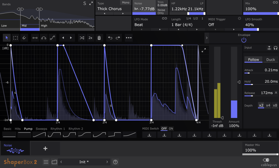 Cableguys schickt mit NoiseShaper ein neues Lo-Fi Effekt- Plug-in in die Studios dieser Welt. Zentrales Element sind die für Cableguys typischen, frei einzeichenbaren oder synchronisierbaren LFOs. Dadurch wird auch visuell jede Modulation ersichtlich. LFO-Bearbeitungen lassen sich mit unbegrenzter Undo-Funktion wiederherstellen. Die Quantisierung der LFOs erstreckt sich von 1/128 bis zu 32 Takten.