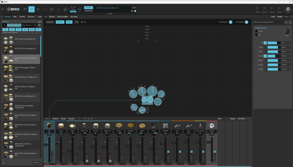 Mit BFD Drums 3.5 präsentiert FX Pansion die neueste Generation ihres Plug-ins für die Schlagzeugproduktion. Für das Update wurde vor allem unter der Haube an der Engine geschraubt, um den Realismus und die Klanganpassung noch weiter zu steigern. Optisch wurde die Bedienoberfläche mit neuen Icons und verbesserter Navigation aufgefrischt. Außerdem gibt es einen neuen Mixer und einen Sound-Browser für mehr Komfort. BFD Drums 3.5 ist mit 51 Drum-Kits ausgestattet, die sich für Rock, Jazz und Metal eignen. Um nicht lange zu schrauben, gibt es ab Werk 60 vorkonfigurierte Kits mit benutzerdefinierten Artikulationen und Effekten für glanzvolle Drums.