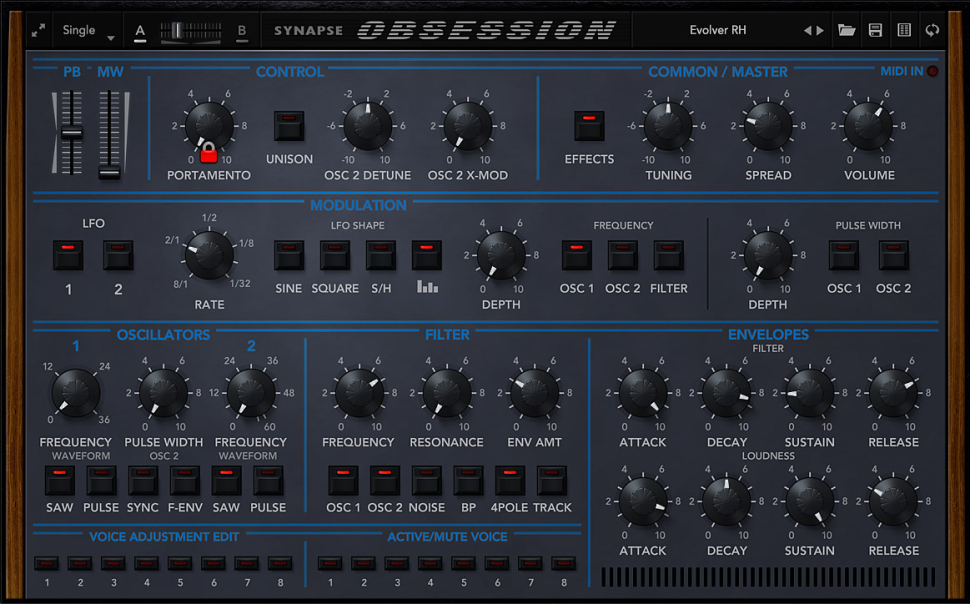 Durch die Installation werden alle Werksklänge in den Unterordner "Obsession Factory" verschoben. Hinzu kommen der Single, Dual und Split-Modus. Als Emulation an den legendären Oberheim-Synthesizer, wurden in das Vintage-Plug-in zwei Oszillatoren, ein umschaltbarer Zwei-/Vierpol-Tiefpassfilter, zwei ADSR-Hüllkurvengeneratoren und zwei LFOs integriert.