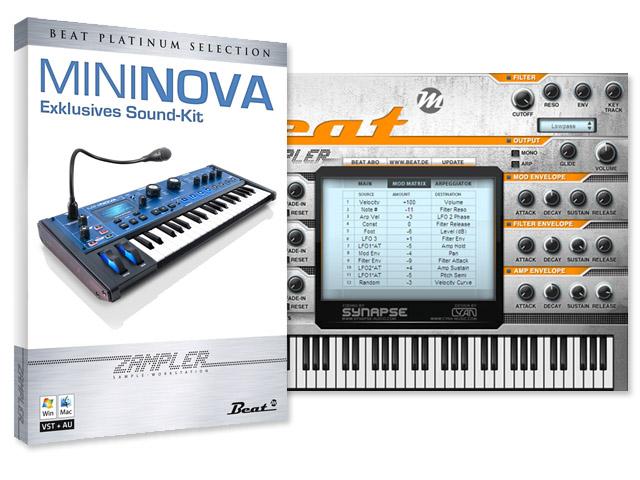 Exklusive für Beat bringt der Sound-Guru Marco Scherer den Klang des MiniNova nun auf den Desktop – in Form von 20 exklusiven Patches für den Beat-Sample-Player „Zampler“. Seien es nun Dub-Bässe, Hybrid- oder Mechano-Sounds, Synth-Pop-Klänge oder Space Glasses – die 120 MB große Klangbibliothek gibt einen Einblick in das beeindruckende Sound-Spektrum von Novations Mini-Synthesizer, der die gleiche Klangerzeugung wie UltraNova besitzt.